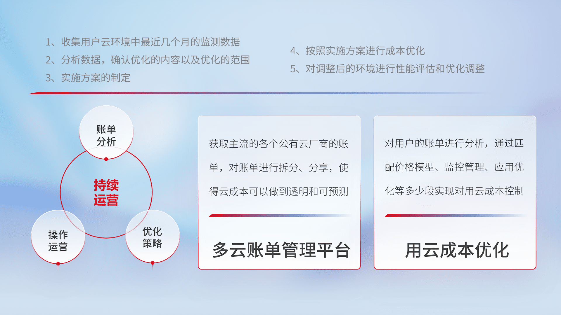 通过多云纳管,,,,以统一的资源数据模型把客户的云资源进行抽象和封装,,,进而实现对多云资源的统一操作,,,保障云资源管理的可靠性、、、、稳定性与可用性。。。量身定制化运维内容,,,配置、、、、开发运维、、补丁管理、、备份、、、监控、、认证和访问管理、、审计和日常巡检等,,保障在用云过程中的可靠度,,,稳定度以及高可用率。。。。